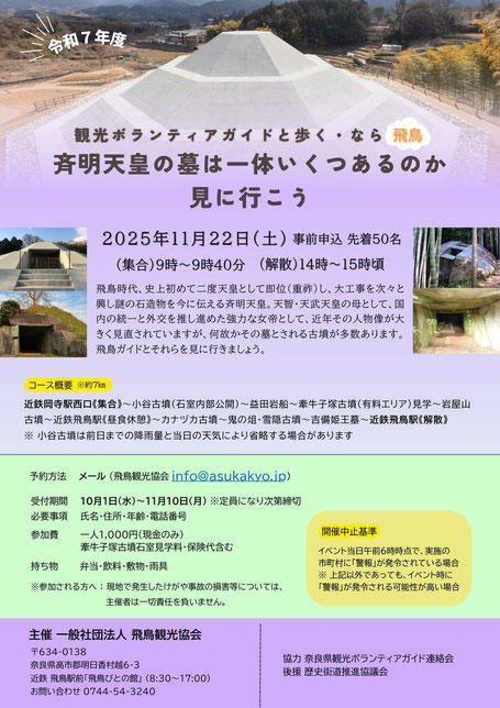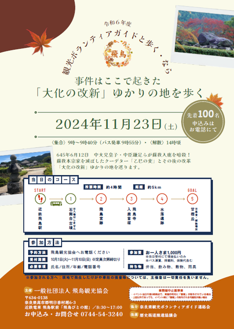 飛鳥観光協会(info@asukakyo.jp)までお申し込みください。