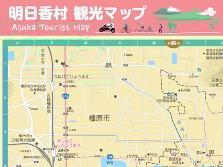【表面】主要な史跡や社寺、飲食店・お買い物スポットの載っているイラストマップ。